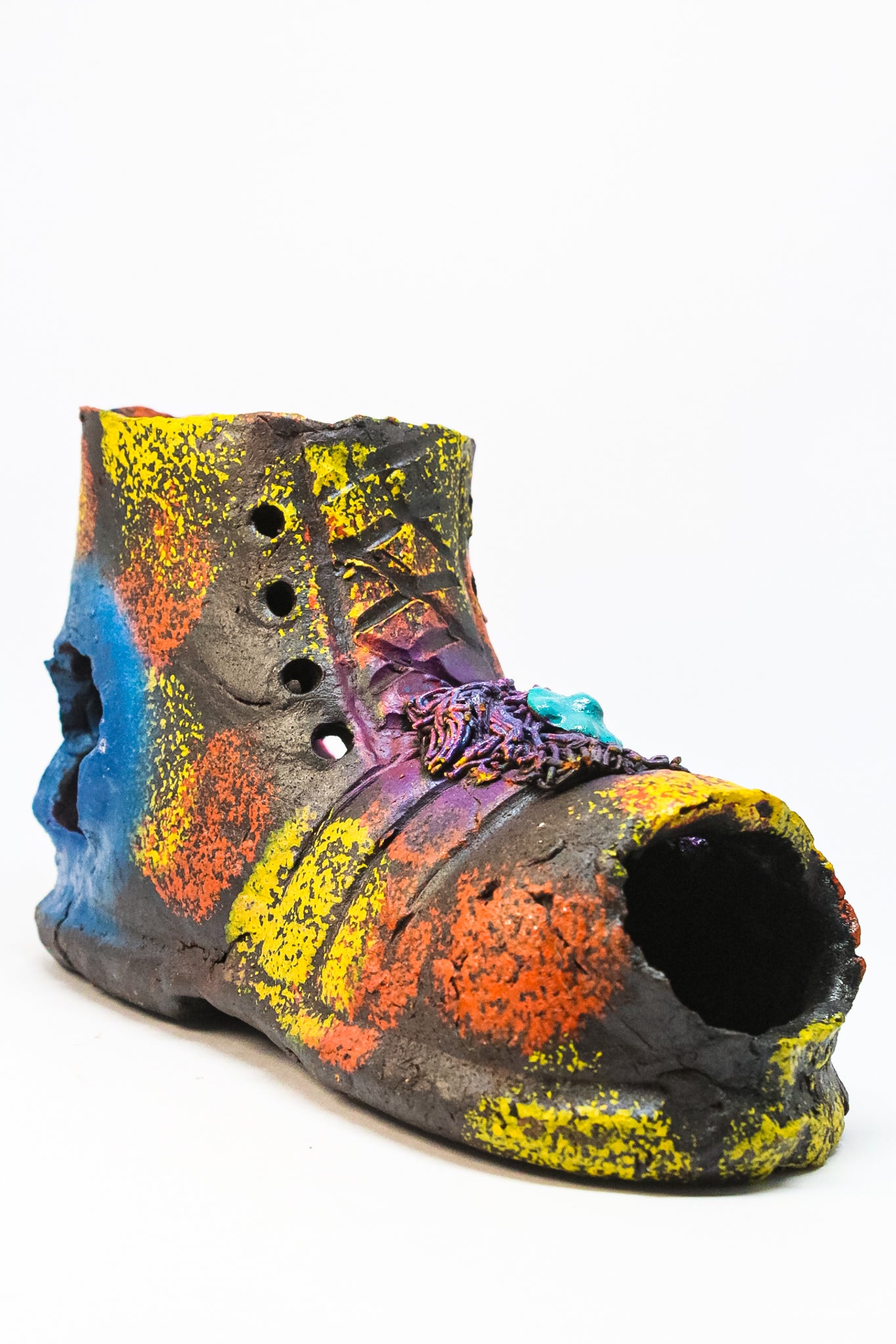 Decoración de cerámica en forma de bota grande, perfecta para acuarios grandes. Su tamaño y diseño único ofrecen un lugar interesante para que los peces se escondan y jueguen.