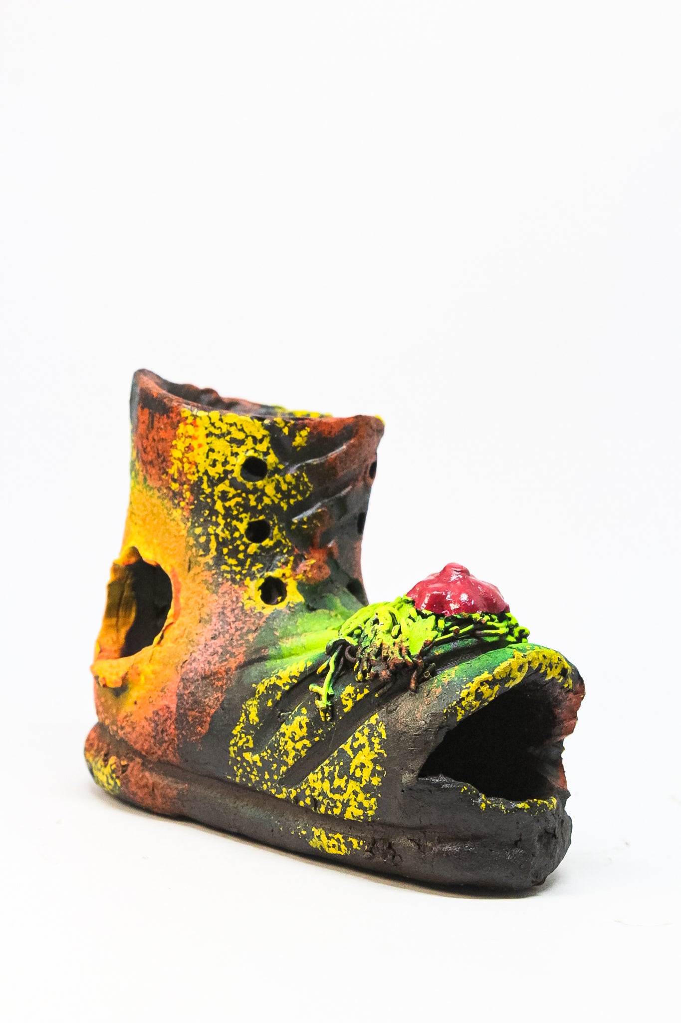 Figura de cerámica en forma de bota, diseñada para acuarios medianos. Su tamaño y diseño le dan un toque único al entorno acuático, sirviendo también de refugio para peces pequeños.