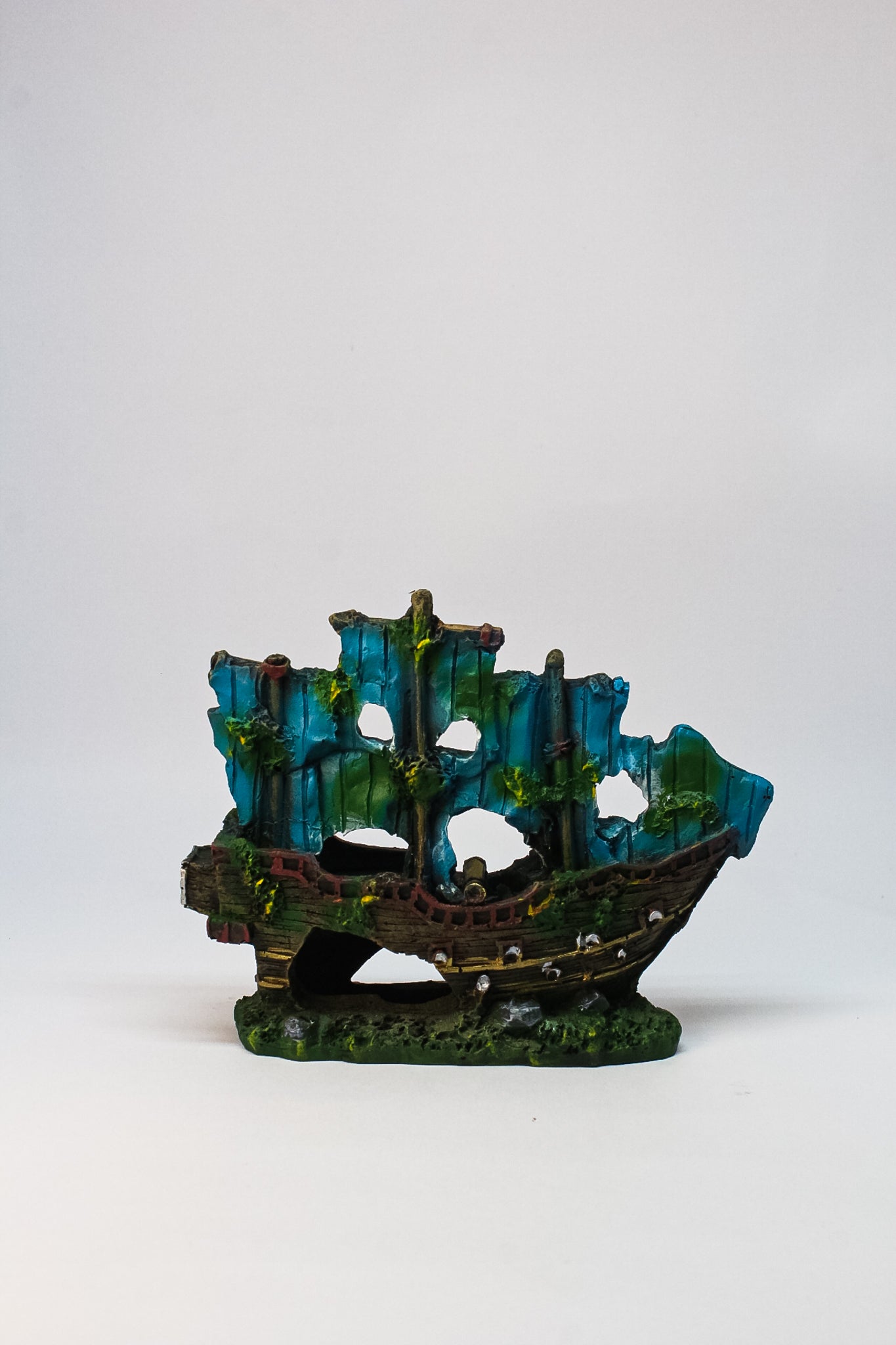 Decoración de cerámica con forma de barco naufragado. Su diseño realista con detalles envejecidos crea un ambiente misterioso en el acuario, proporcionando escondites y zonas de exploración para los peces.